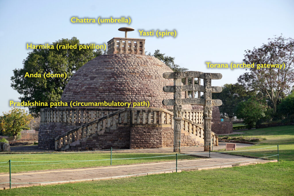 - The arched gateway is called ’torana’, the circumambulatory path is called ‘pradakshina patha’, the body of the Stupa is called ‘anda’, the pole at the top is called ‘yasti’, and the railed platform surrounding the ‘yasti’ is called ‘harmika’.